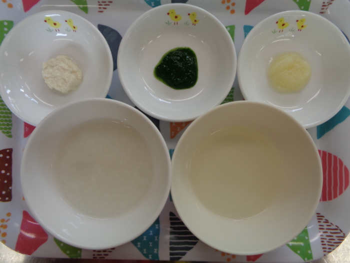 離乳食(初期)は、10倍粥、豆腐ペースト、キャベツペースト、ほうれん草ペースト、野菜スープです。