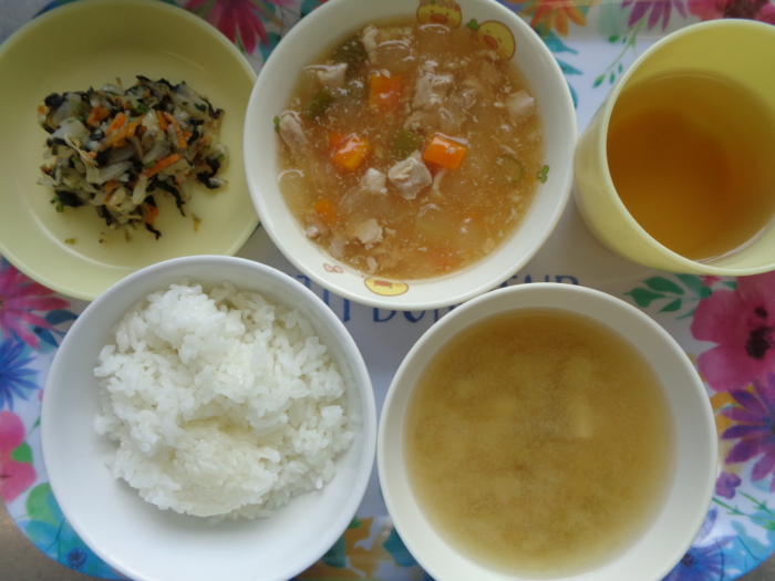 今日の給食は、ごはん、冬瓜と鶏肉の煮物、磯和え、なすの味噌汁です。