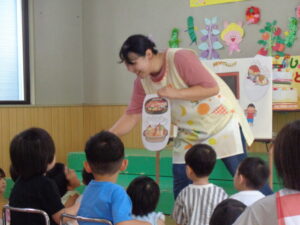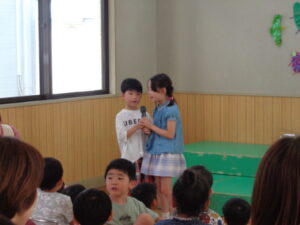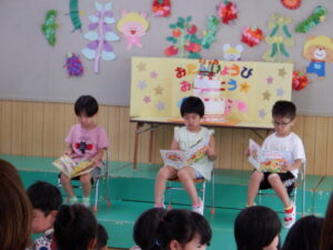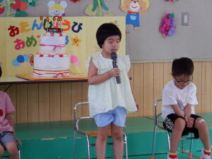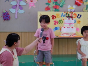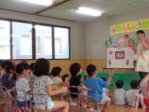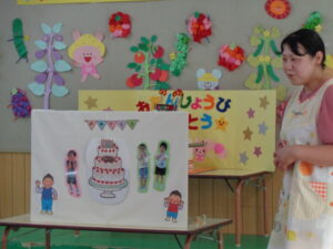 今日は8月生まれの誕生会があり、3人のお友達がステージに上がりました。インタビューに元気に答えたり、将来の夢を堂々と発表したり、とても素敵でした。先生からのお楽しみのプレゼントは、『まほうの電子レンジ』というパネルシアターでした。最後には誕生児のお友だちもパネルに登場し、盛り上がりましたよ♪