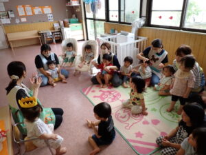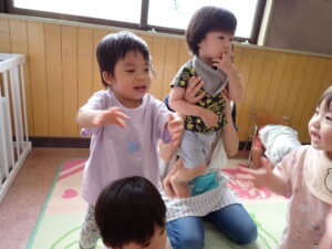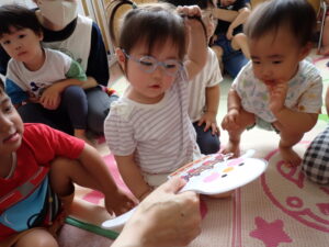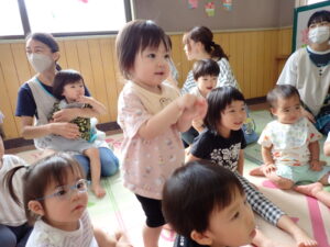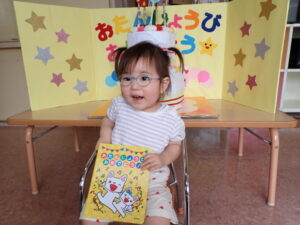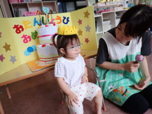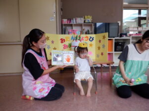 今日は、8月生まれの誕生日会があり、1人のお友達がお祝いしてもらいました!みんなの前で少し緊張している様子でしたが、先生からの出し物の、「くいしんぼうおばけ」が始まると、大好きなお歌に体をゆらゆらさせて楽しむ姿が見られました!他のお友達も、「くいしんぼうの~おばけのこ~」とお歌が始まると、一緒に歌ったり、手を叩いたりして盛り上がりましたよ~!!また一つ大きくなったね!お誕生日おめでとう♡