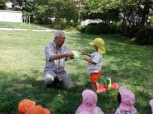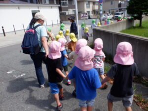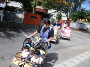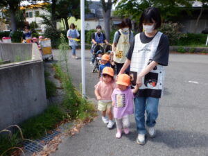 今日は、保育園の厨房からの出火を想定しての避難訓練を行いました。一次避難は園庭。二次避難は沼田公園。お友だちと手をつなぎ、車に気をつけながら公園まで避難しました。