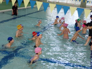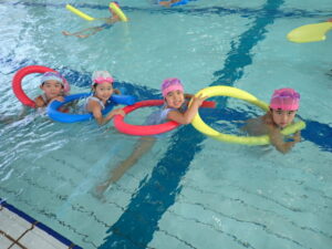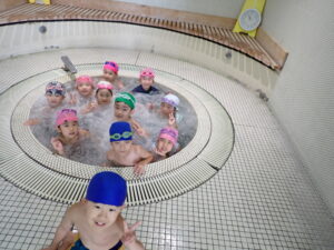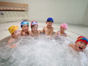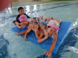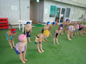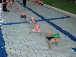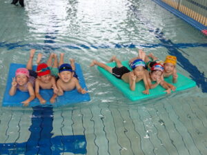 今日は、ぞうくみ、きりんくみが県立総合プールに行きました。ぞうくみは去年活動していますが、きりんくみは初めてだったのでちょっぴり緊張している姿も見られましたが、いざプールに入るとみんなとても喜んでいた子どもたちです。 バタ足、ワニ歩き、宝探し、カニ歩きをしたり、最後は浮島や浮棒、ビート板を使って楽しく遊んでいましたよ♪
