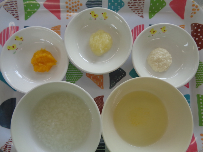 離乳食(初期)は、10倍粥、豆腐マッシュ、さつま芋・南瓜マッシュ、キャベツマッシュ、野菜スープです。