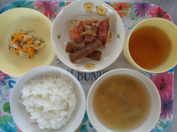 今日の給食は、ごはん、赤魚の煮付け、ゆかり和え、オクラの味噌汁です。