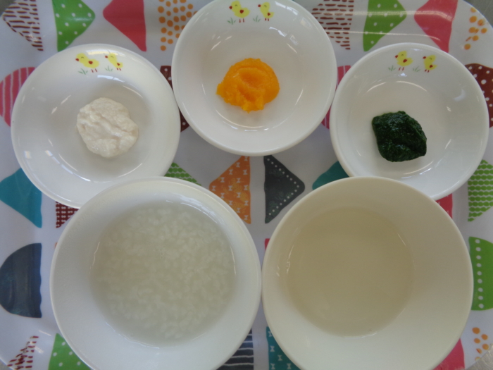 離乳食(初期)は、10倍粥、ささみマッシュ、ほうれん草マッシュ、人参マッシュ、野菜スープです。