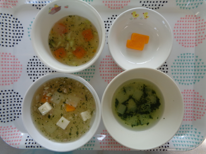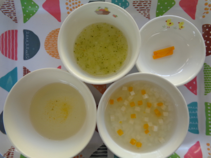 離乳食(中期)は、豆腐と野菜のあんかけ粥、ブロッコリーのだし煮、野菜スープ、人参スティックです