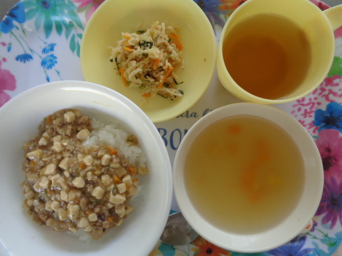 今日の給食は、マーボー丼、三色ナムル、春雨スープです。