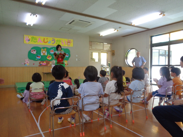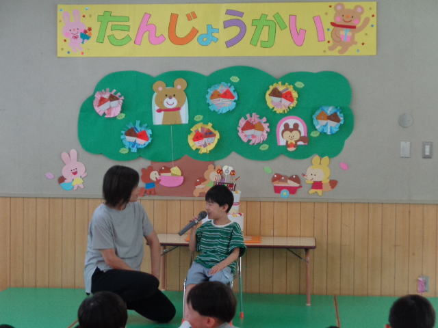 今日は、9月生まれのお友だちのお誕生会をしました。今月のお誕生児は1名のみ。ちょっぴり緊張したようです。先生からの出し物はエプロンシアターとマジック。興味津々の子どもたちでした。 またひとつ大きくなったね。お誕生日おめでとう!!