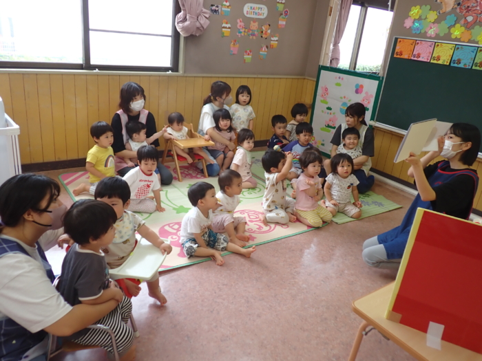今日は、9月生まれのお友だちのお誕生日会がありました。3人のお友達が前に出てお祝いしてもらいました!みんなの前に出て少しドキドキな3人でしたが、お名前を呼ばれると、「はーい」とお返事が出来たり、笑顔を見せてくれたりしました!先生からの出し物は、「シルエットクイズ」でした!みんなが見たことのある果物や食べ物が出てきて、「おいしそうだね」「たべたいね」と楽しそうな声がたくさん聞こえてきましたよ~!また一つ大きくなったね!お誕生日おめでとう♡