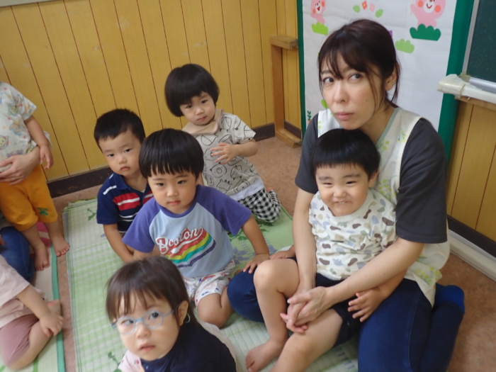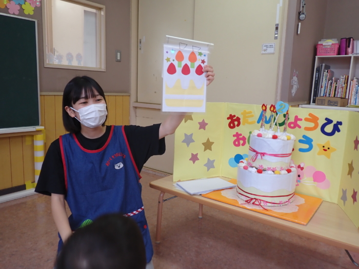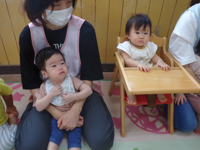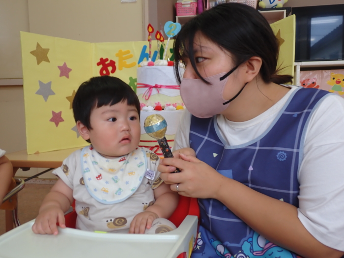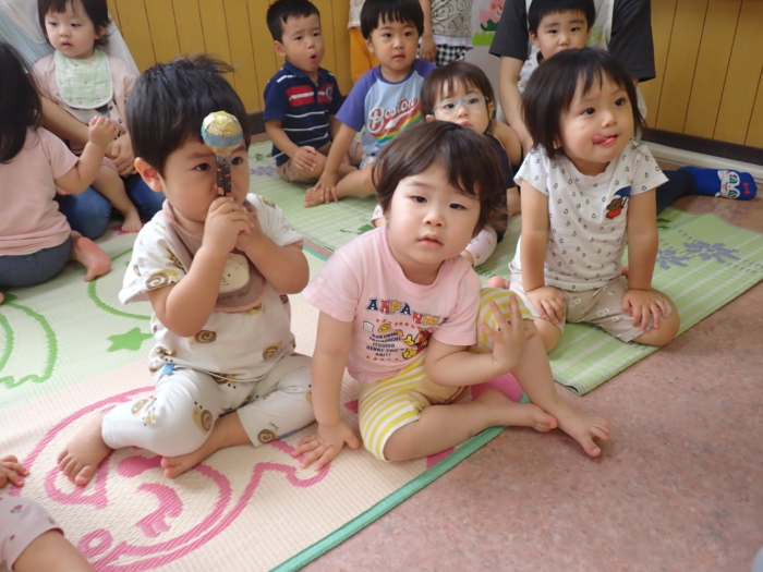 今日は、9月生まれのお友だちのお誕生日会がありました。3人のお友達が前に出てお祝いしてもらいました!みんなの前に出て少しドキドキな3人でしたが、お名前を呼ばれると、「はーい」とお返事が出来たり、笑顔を見せてくれたりしました!先生からの出し物は、「シルエットクイズ」でした!みんなが見たことのある果物や食べ物が出てきて、「おいしそうだね」「たべたいね」と楽しそうな声がたくさん聞こえてきましたよ~!また一つ大きくなったね!お誕生日おめでとう♡