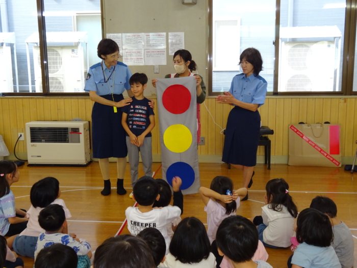 今日は交通安全教室がありました。交通安全にちなんだ○✖クイズをしながら、信号はいつ渡っていいのかや、車が曲がってくるときにどこが安全かなどを教えていただきました。