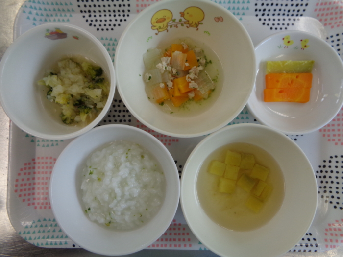 離乳食(後期)は、青のり入り粥、鶏肉と野菜のコンソメ煮、キャベツの和え物、さつま芋の味噌汁、人参・さつま芋スティックです。