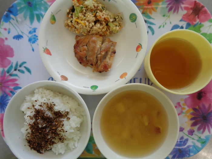今日の給食は、ミネラルふりかけごはん、鶏肉のねぎ塩だれ、納豆和え、さつま芋の味噌汁。