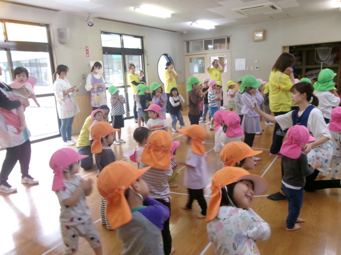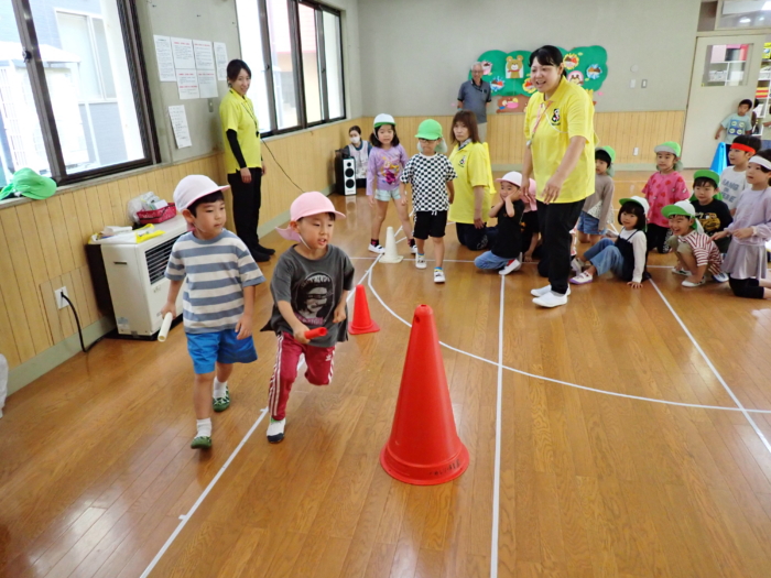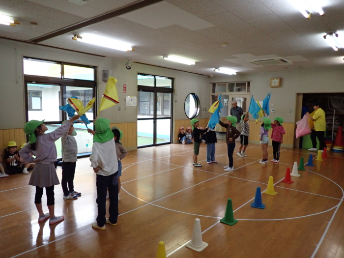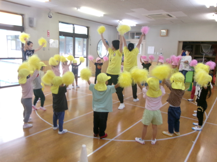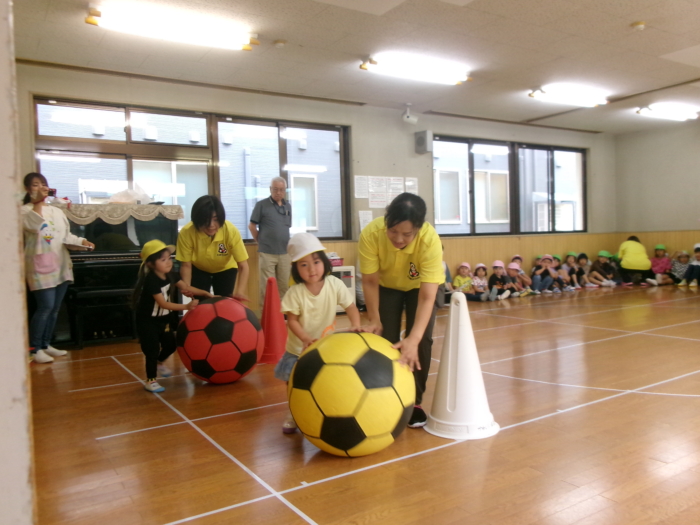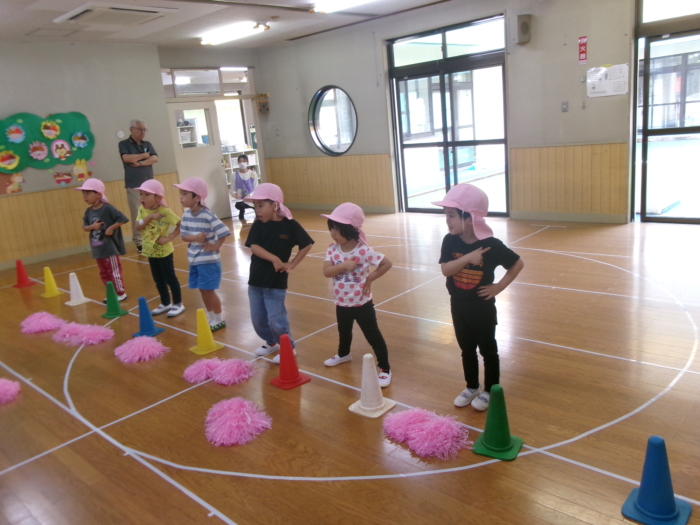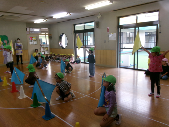 今日は川尻小学校で予行練習を行う予定でしたが、雨のためホールで行いました。小さいクラスのお友達は競技の雰囲気を味わったり、大きいクラスのお友達はクラスの競技の確認をしましたよ。本番は晴れますように…☀