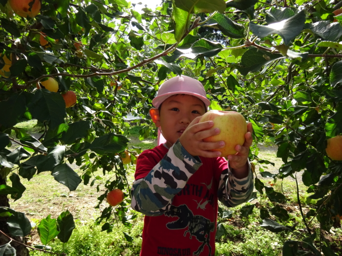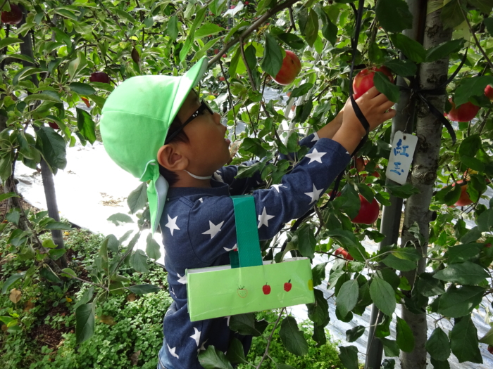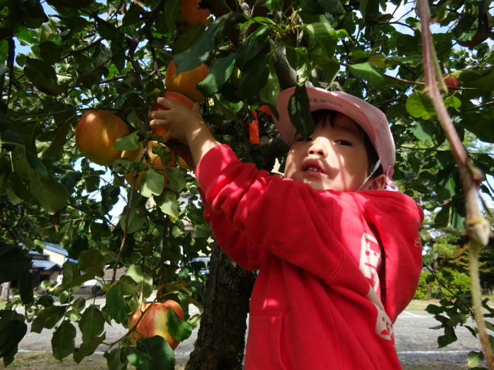 今日はきりんくみとぞうくみが、加賀谷果樹園さんに行ってりんご狩りをしてきました。果樹園の方に収穫の仕方を教えていただいて、上手にもぎ取っていましたよ。自分で収穫したりんごを見て、にこにこの子どもたちでした!