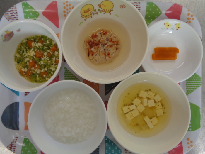 離乳食(後期)は、全粥、ベビーつくね、ささみのサラダ、豆腐のスープ、南瓜スティックです。