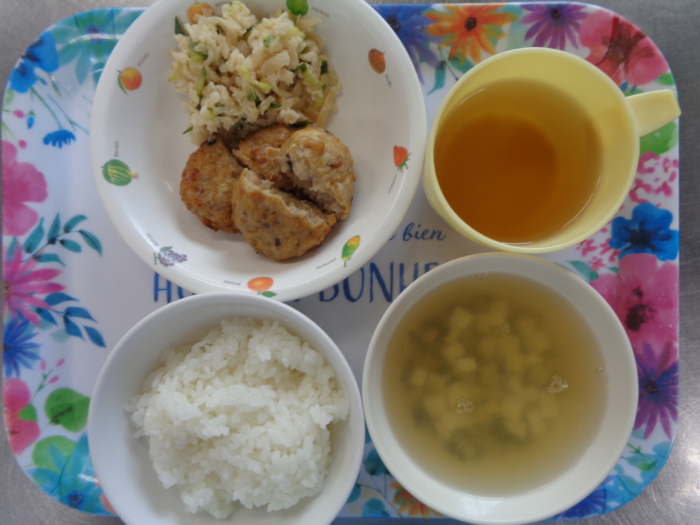今日の給食は、ごはん、中華つくね、切干大根のサラダ、豆腐の中華スープです。
