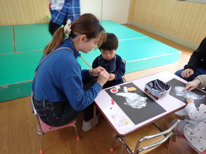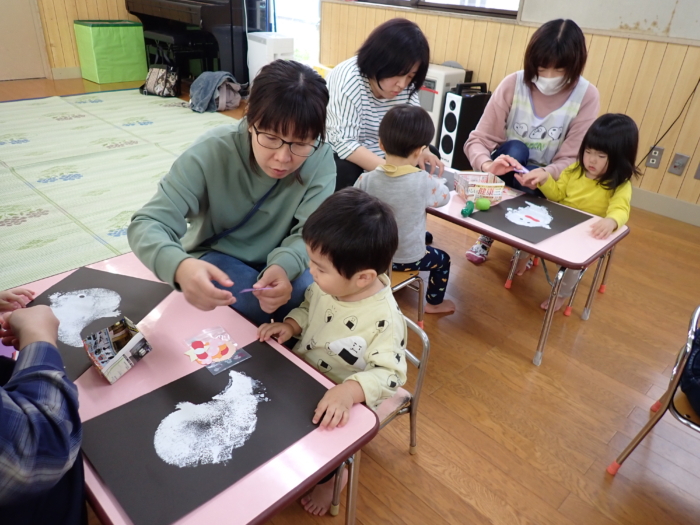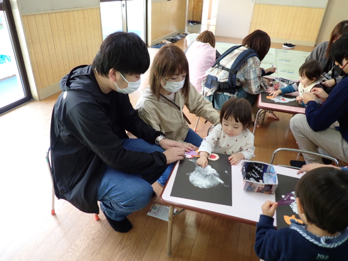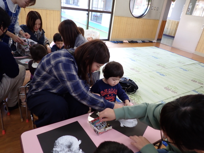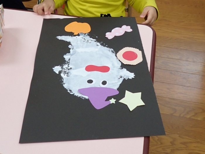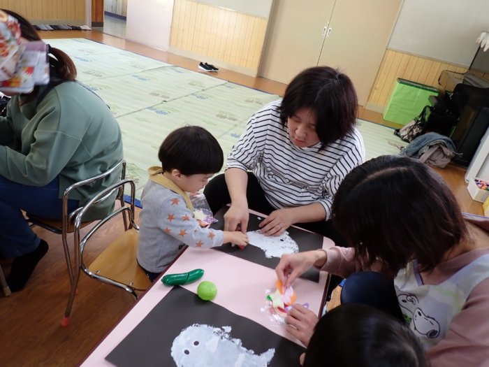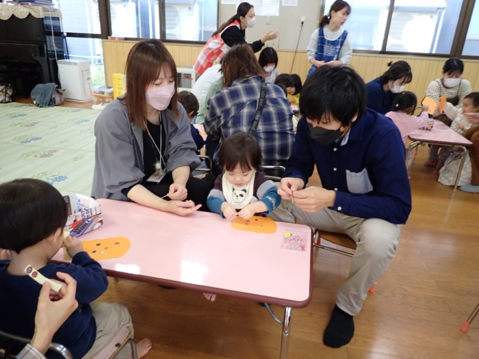 今日は、ひよこくみの保育参観・懇談会がありました。おうちの人と一緒にコーナーあそびで好きなあそびを楽しんだり、ハロウィン製作でおばけを作りました。製作では、シールなどをぺたぺた・・・。かわいいおばけちゃんが完成しました👻
