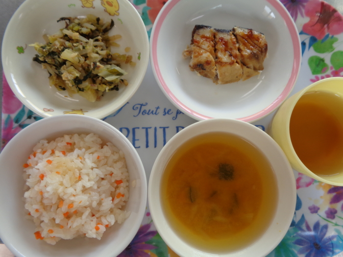 今日の給食は、もみじご飯、ブリの照り焼き、青菜の煮浸し、南瓜の味噌汁です。