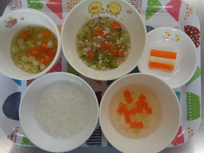 離乳食(後期)は、全粥、鶏肉のコンソメ煮、ポテトサラダ、人参スープ、じゃが芋・人参スティックです。