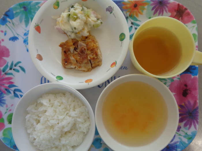 今日の給食は、ごはん、鶏肉のオレンジ焼き、ポテトサラダ、人参スープです。
