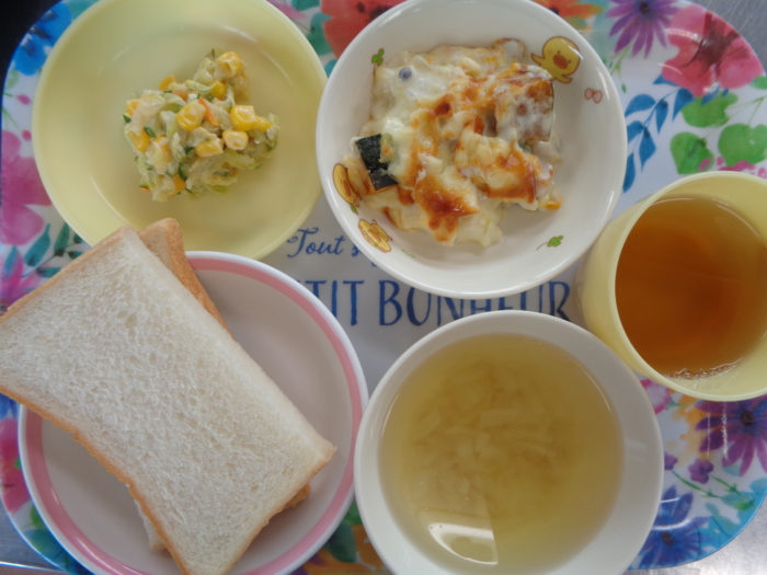 今日の給食は、食パン、南瓜のグラタン、コールスローサラダ、オニオンスープです。