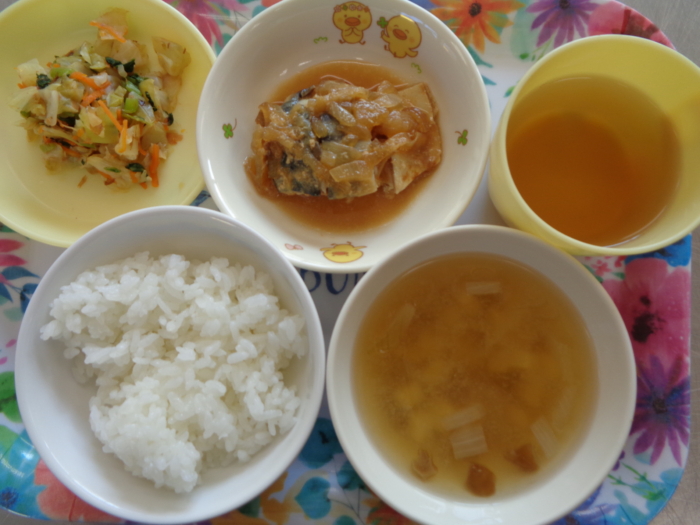 今日の給食は、ごはん、サバの味噌煮、おかか和え、なめこの味噌汁です。