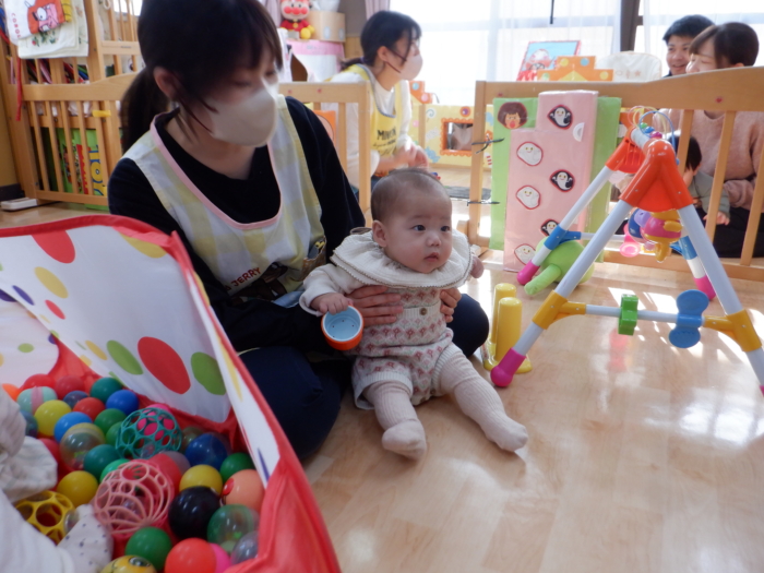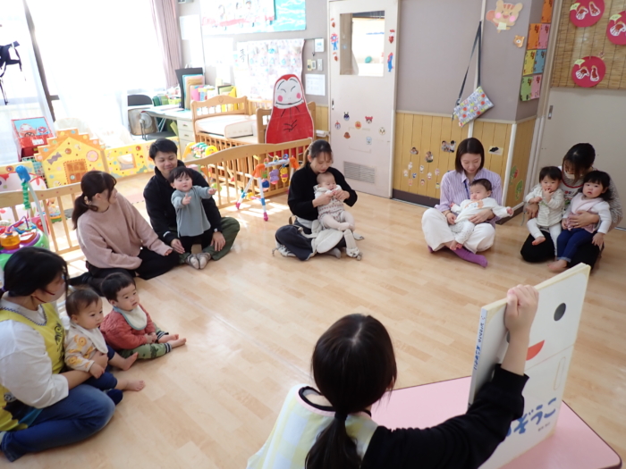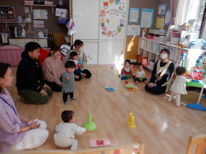 今日の園開放には、3組の親子が来てくれました。たまごくみのお友だちと一緒に遊んだり、お家の人同士で成長を話し合ったり、楽しい時間を過ごしていましたよ♪