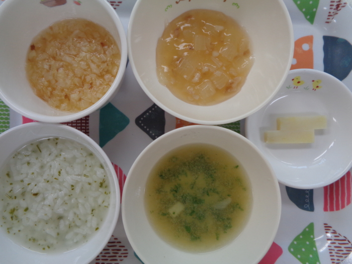 離乳食(後期)は、わかめ入り粥、白身魚のだし煮、キャベツのお浸し、さつま芋の味噌汁、さつまいもスティックです。