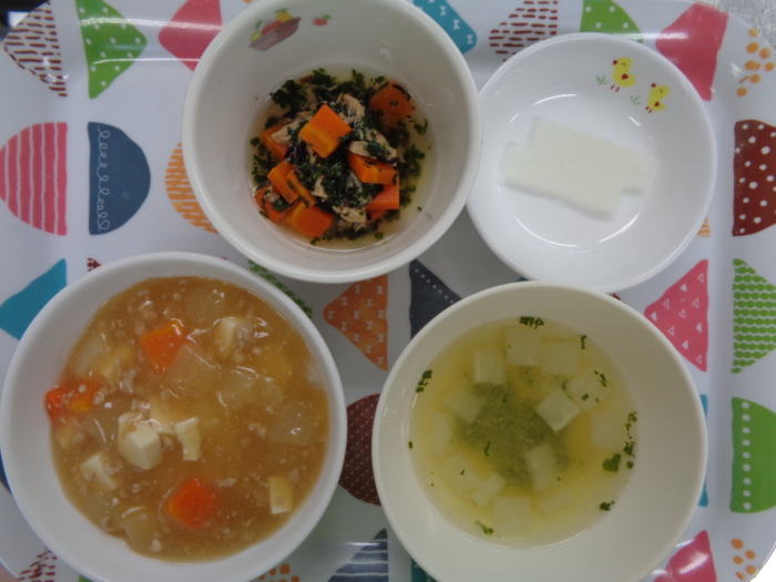 離乳食(後期)は、豆腐のそぼろあんかけ粥、ひじきのサラダ、大根の味噌汁、大根スティックです。