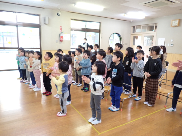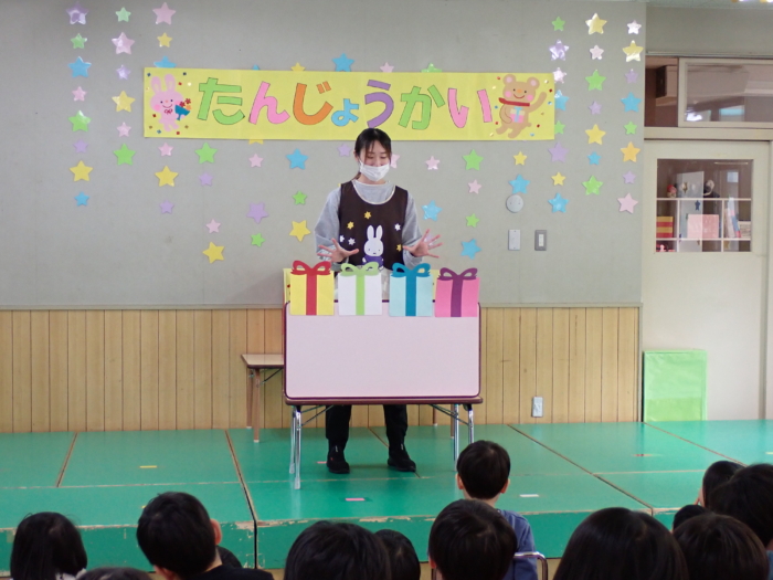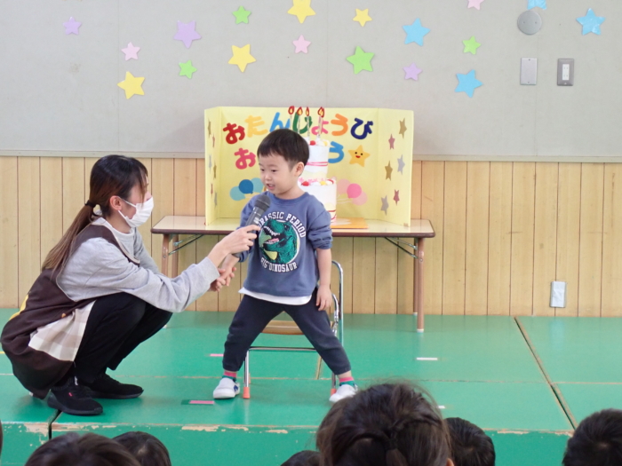今日は大きいクラスの誕生会がありました☆初めて、大きいステージに一人でたちドキドキしたと思いますが、保育者のインタビューに大きい声で答えていましたよ♪先生からのお楽しみのプレゼントはバルーンシアターということで、プレゼントから様々な動物が膨らんで出てくると、子どもたちからは歓声が聞こえ、盛り上がっていましたよ🎂お誕生日、おめでとう☆