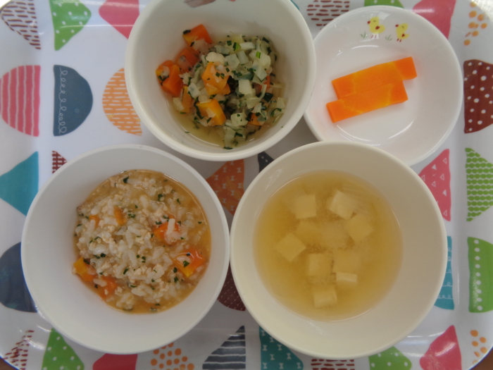 離乳食(後期)は、全粥、キャベツのコンソメ煮、玉ねぎの味噌汁、人参げんスティックです。