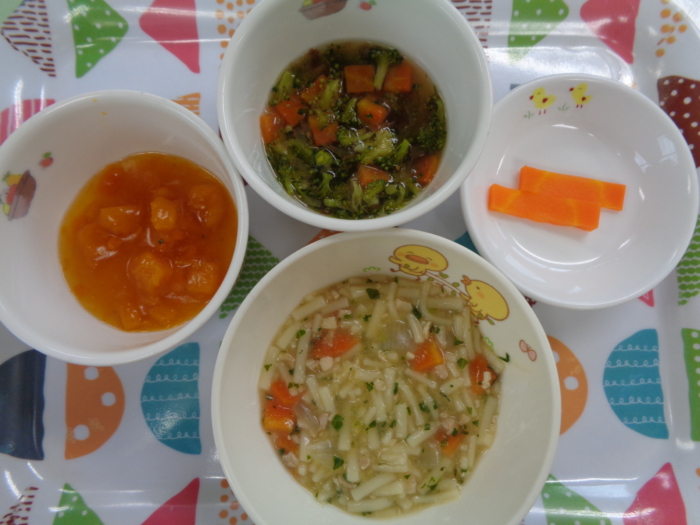 離乳食(後期)は、くたくた煮込みうどん、南瓜の甘煮、ブロッコリーのおかか和え、人参スティックです。