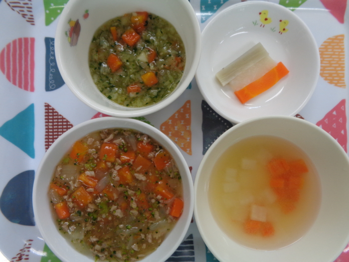 離乳食(後期)は、豚肉と玉ねぎのあんかけ粥、ほうれん草の胡麻和え、根菜の味噌汁、人参・大根・ごぼうスティックです。