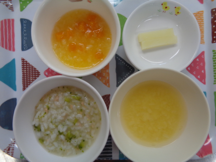 離乳食(後期)は、ツナ入り煮込み粥、南瓜サラダ、キャベツの味噌汁、じゃが芋スティックです。