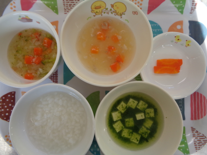 離乳食(後期)は、全粥、白身魚の味噌煮、おかか和え、小松菜の味噌汁、人参スティックです。