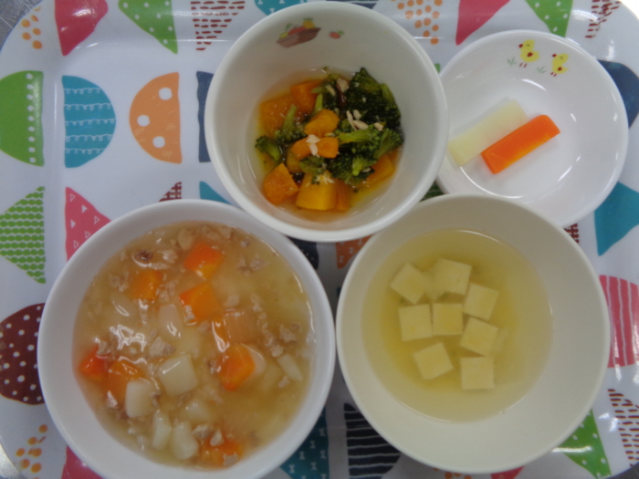 離乳食(後期)は、豚肉と野菜のあんかけ粥、コロコロ野菜サラダ、豆腐の味噌汁、じゃが芋・人参スティックです。