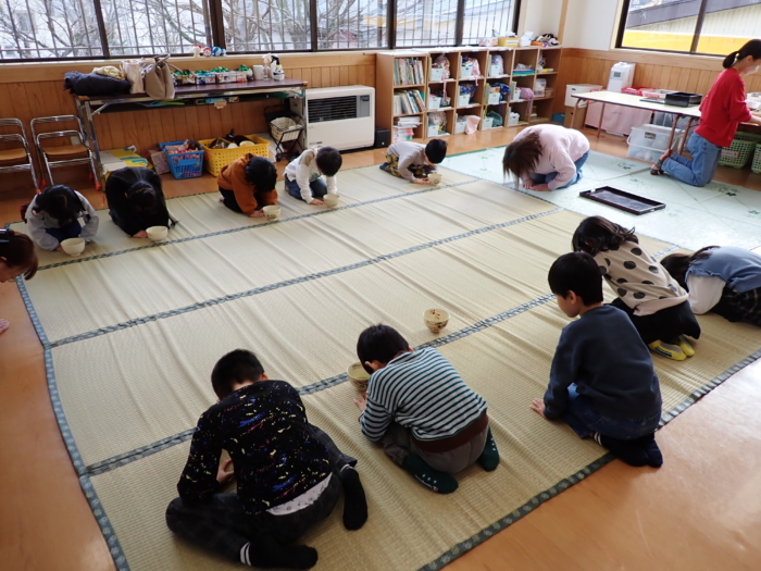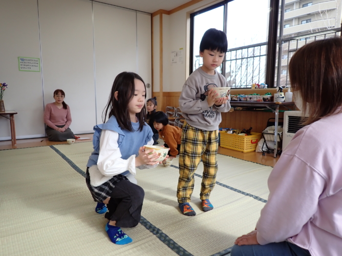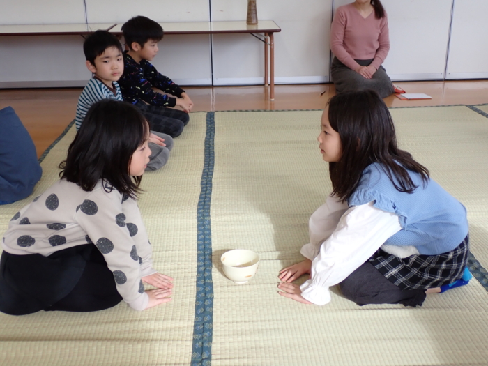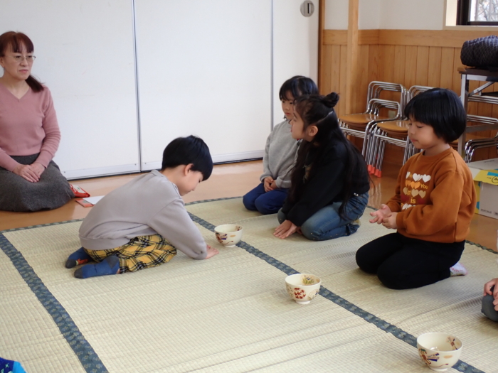 今日はぞう組さんが茶道教室に参加しました。作法にも慣れ、落ち着いて参加していた子どもたちです。今日のお菓子は塩ようかん、お花はアヤメとガーベラとカーネーションでした。