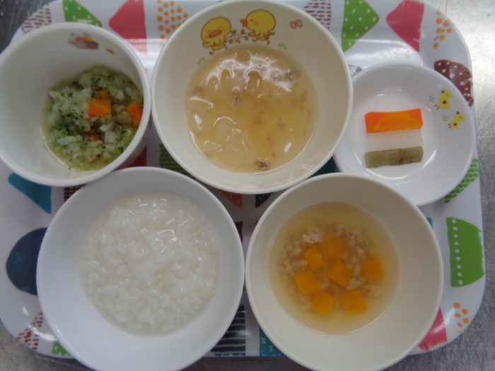 離乳食(後期)は、全粥、豚肉と大根の煮物、キャベツのくたくた和え、南瓜の味噌汁、大根・ごぼう・人参スティックです。