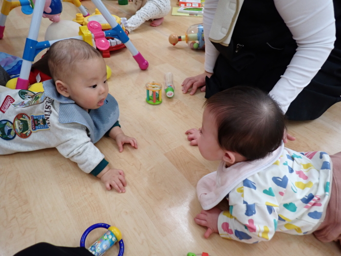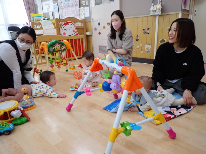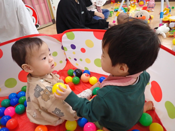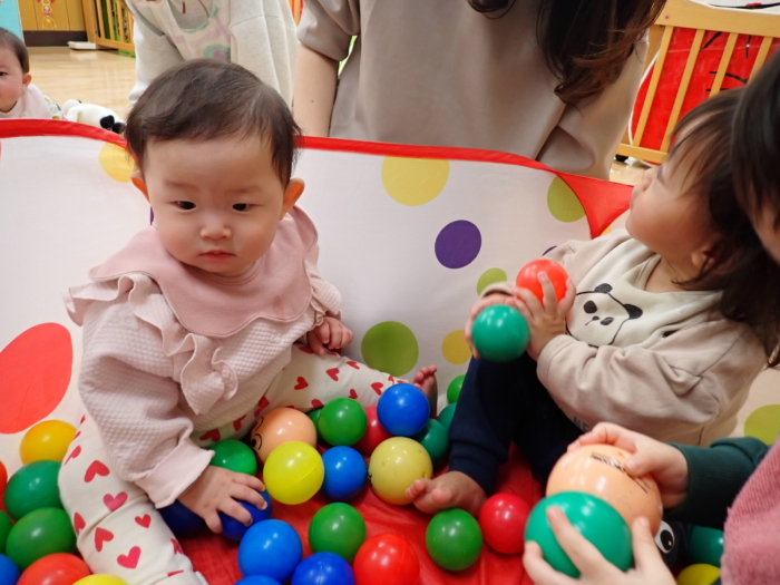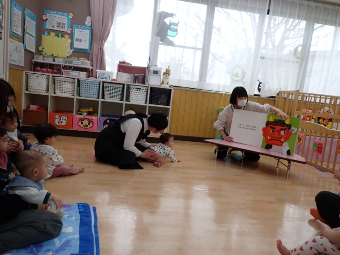 12月の園開放には4組の親子が遊びに来てくれ、0歳児クラスのお友だちと一緒に遊びました♪もうすぐクリスマスということで、足形を取ったり、シール貼りをしたサンタさんの製作を楽しみました。また、大型絵本「おめんです」のお話にも釘付けの子どもたちでした☆また遊びに来てくださいね!