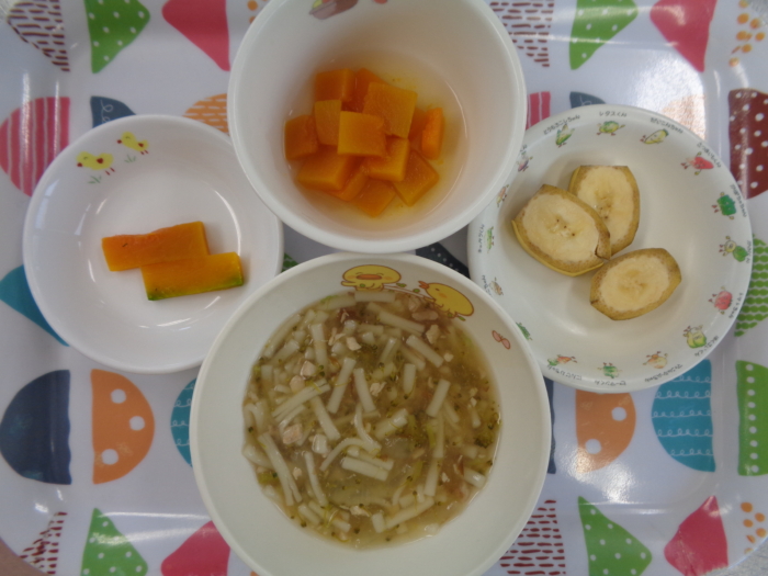 離乳食(後期)は、鶏肉の煮込みうどん、南瓜の甘煮、フルーツ・バナナ、南瓜スティックです。
