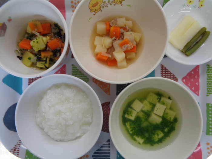 離乳食(後期)は、全粥、肉じゃが、磯和え、ほうれん草の味噌汁、じゃが芋・いんげんスティックです。