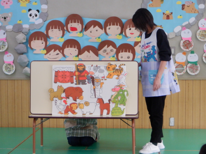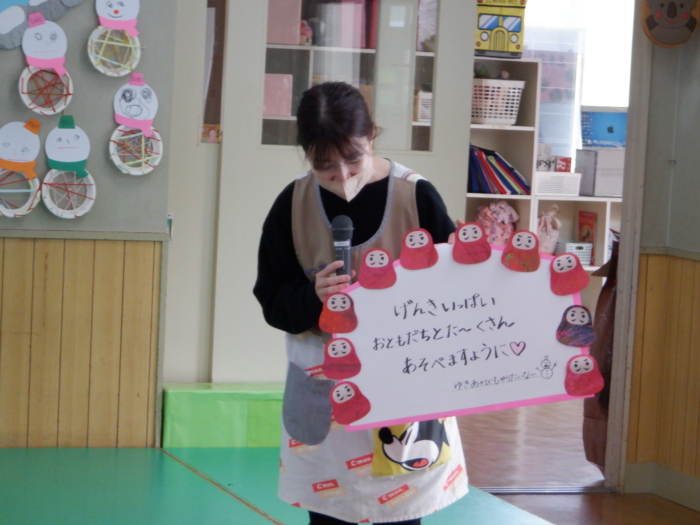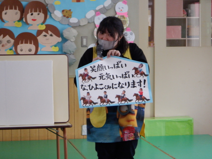 今日は新年を祝う会がありました。各クラス、今年の目標をかいた絵馬を見せ合ったり、「ゆき」の歌を歌ったり、十二支のペープサートを見たりして楽しみましたよ🐎