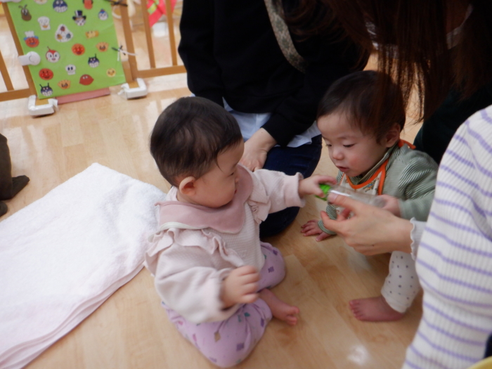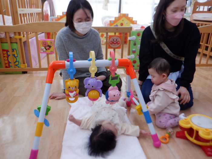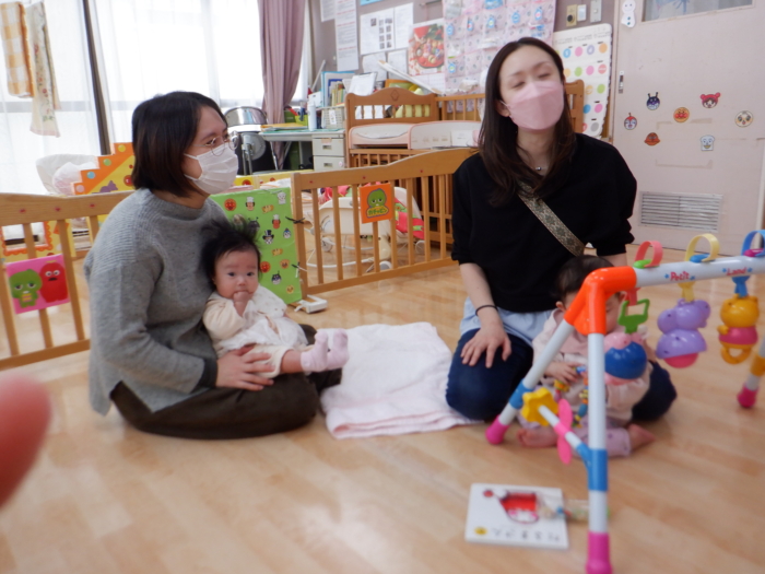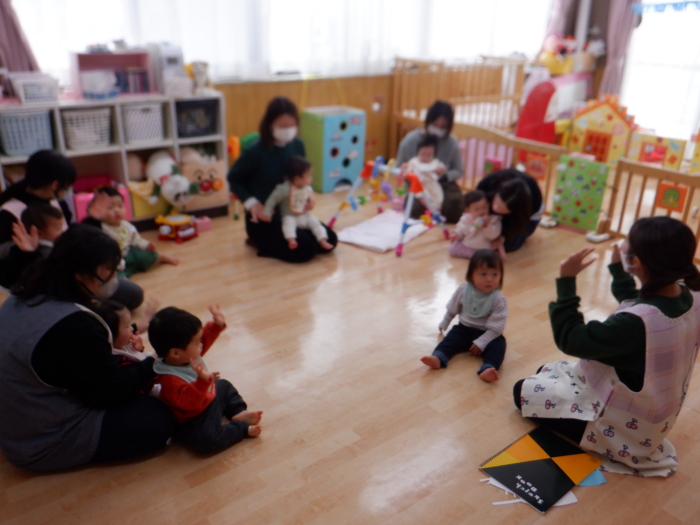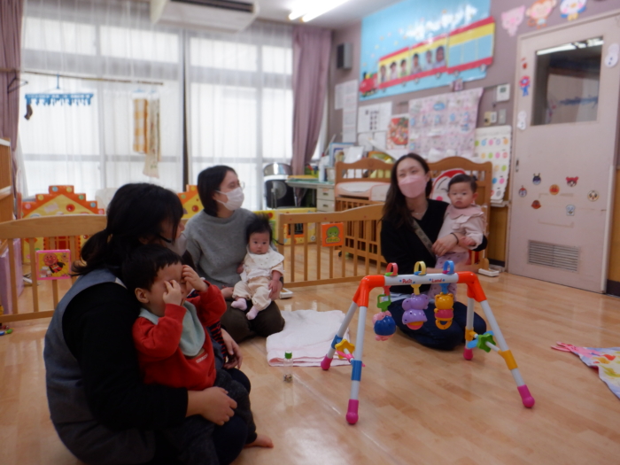 1月の園開放には3組の親子が遊びに来てくれました!たまご組のお友だちと一緒に遊んだり、お家の人同士でお話をしたり、楽しい時間を過ごしましたよ♪また、手遊びをしたり、スケッチブックシアター「コンコンクシャン」を見たりしました!雪が降る中、遊びに来てくださりありがとうございました!