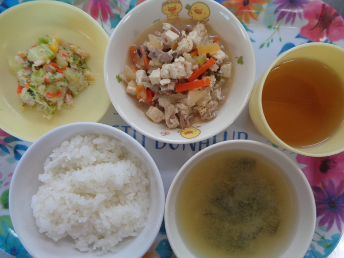 今日の給食は、ミネラルふりかけごはん、肉豆腐、カリブロサラダ、小松菜の味噌汁です。