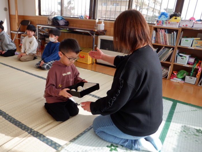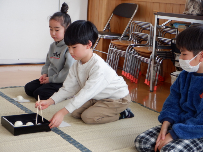 お菓子は上生菓子の「えくぼ饅頭」。箸で上手に取ろうと、一生懸命に取り組む姿がとても印象的でした。