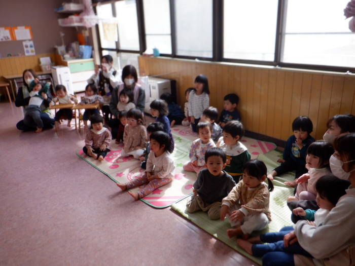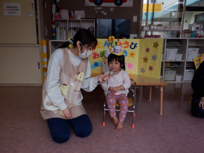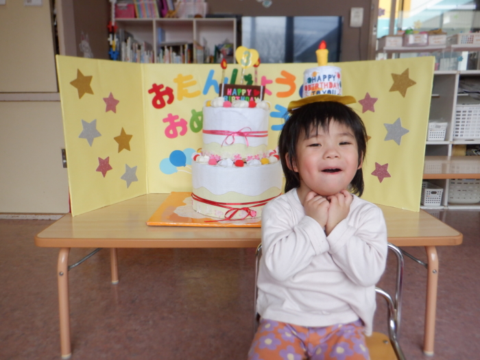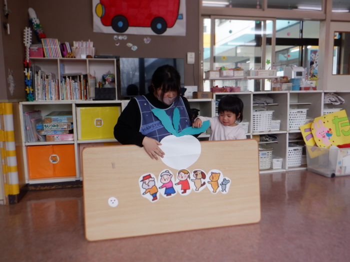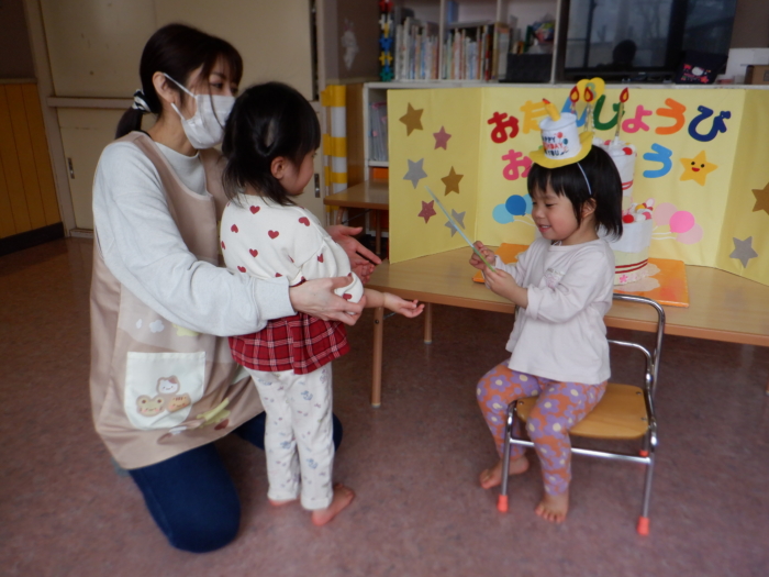 今日は、未満児クラスの3月生まれの誕生日会がありました!りす組から1人のお友だちがみんなにお祝いしてもらいましたよ(^^)/クラスのお友だちから誕生日カードをもらい、とてもうれしそうにする姿が見られました!先生からの出し物は「おおきなかぶのパネルシアター」でした!みんなの「よーいしょ‼よいしょ!よーいしょ~♪」の歌で大きいカブがぬけました!誕生児のお友だちにも手伝ってもらいましたよ♡また一つ大きくなったね!お誕生日おめでとう♡