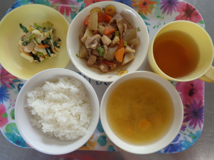 今日の給食は、ごはん、筑前煮、納豆和え、南瓜の味噌汁です。