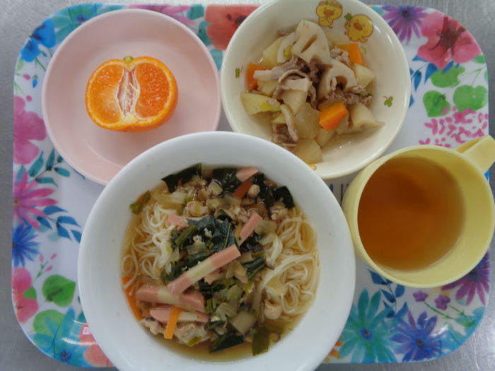 今日の給食は、具だくさんにゅう麵、根菜の煮物、フルーツ・オレンジです。