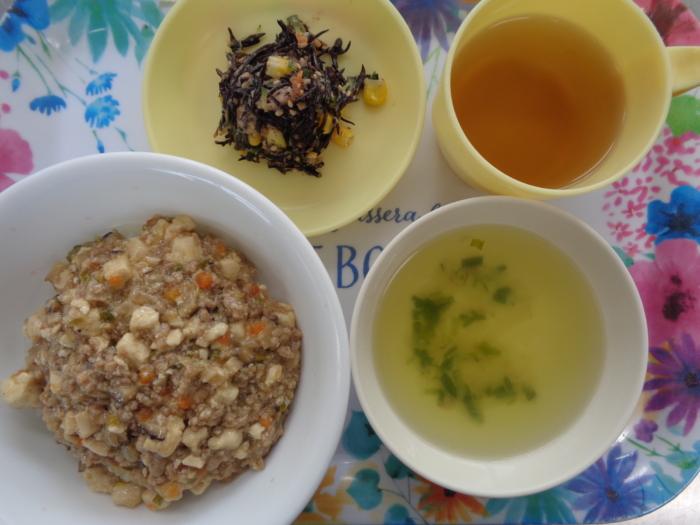 今日の給食は、マーボー丼、ひじきのサラダ、中華風野菜スープです。
